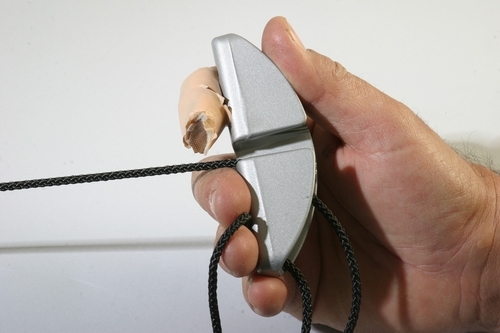 The hook connects to a spool using a drawstring that is looped onto the hook.